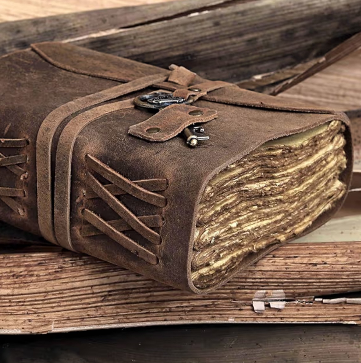 Antique handmade leather-bound journal with deckle edge pages. Designed to journal your process to your progress.
